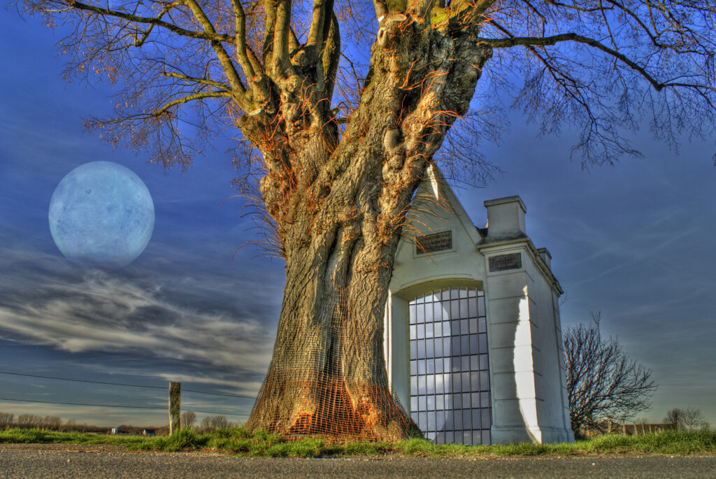 Das Mennikens-Heiligenhäuschen in meinem Heimatdorf – hier in einer Fotomontage mit einkopiertem Mond und einer „eingebauten“ Glasfassade. Die schöne alte Weide musste aufgrund ihres schlechten Zustandes im Jahr 2009 leider entfernt werden und wurde durch einen neuen Baum hinter dem Häuschen ersetzt.